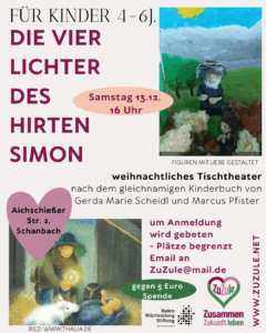 Sa 13.12. >> ZuZule Weihnachtsgeschichte / Tischtheater für Kinder von 4 bis 6 Jahren "Die 4 Lichter des Hirten Simon" (um Anmeldung wird gebeten, Plätze begrenzt)