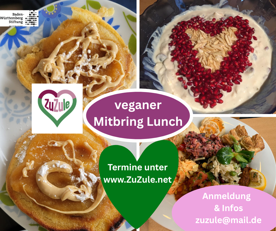 ZuZules veganer Mitbring Lunch Termine: Sa 18.10.25 Jede einzelne pflanzliche Mahlzeit spart immens Wasser(verschmutzung), Treibhausgase & verbrauchte Landfläche, bringt uns selbst in ein besseres Wohlbefinden und sagt JA zum Respekt vor dem Leben aller Tiere. Mach mit und probier pflanzliches Kochen oder Backen aus - in geselliger Runde ist das noch viel schöner :-) So […]
